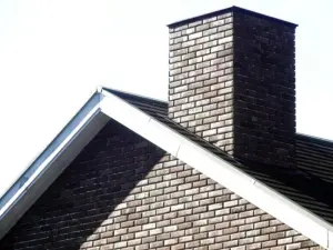 映える煙突と、レンガ調の破風